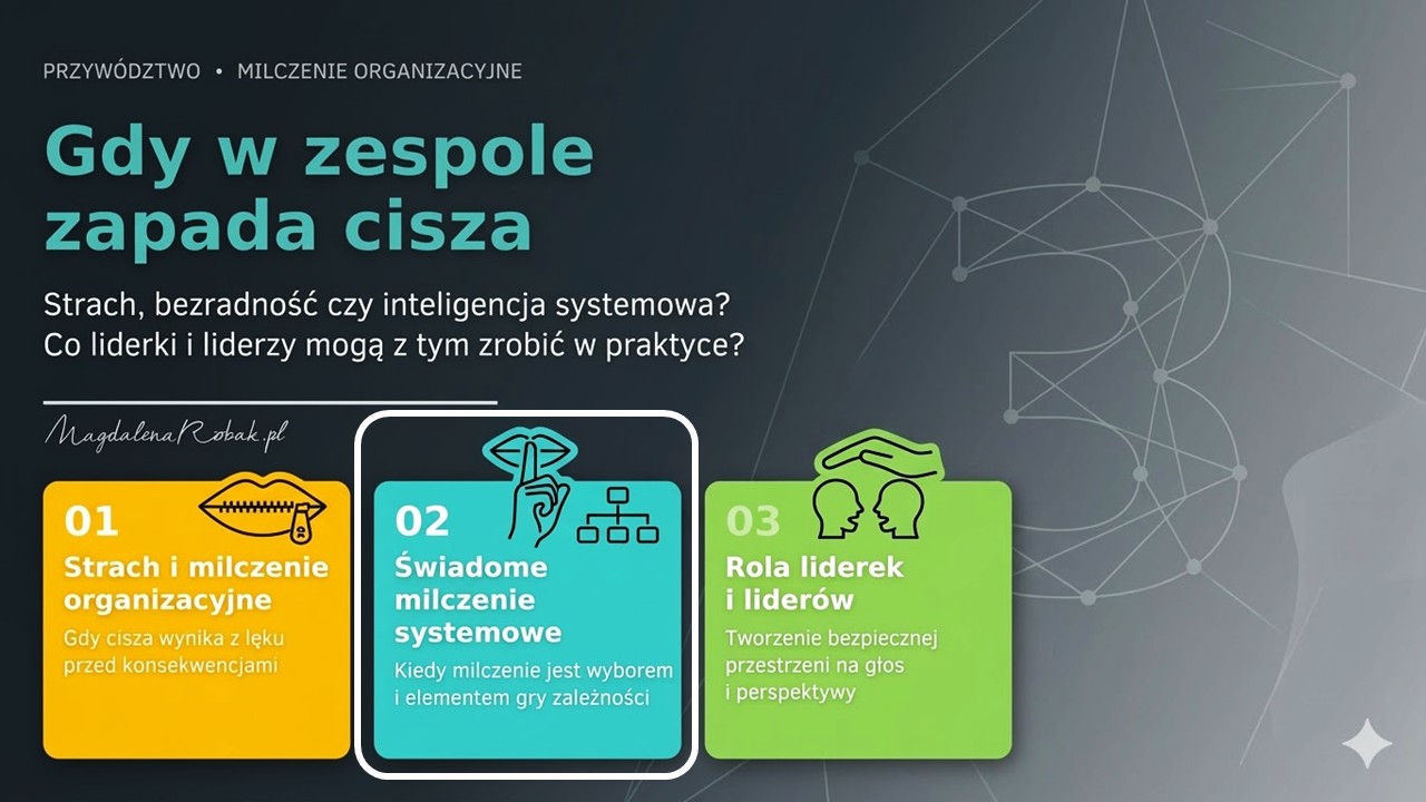 Jak odróżniać „milczenie organizacyjne” od „inteligencji systemowej”? Co mogą z nimi zrobić liderki i liderzy w codziennej praktyce? Dziś o milczeniu organizacyjnym.