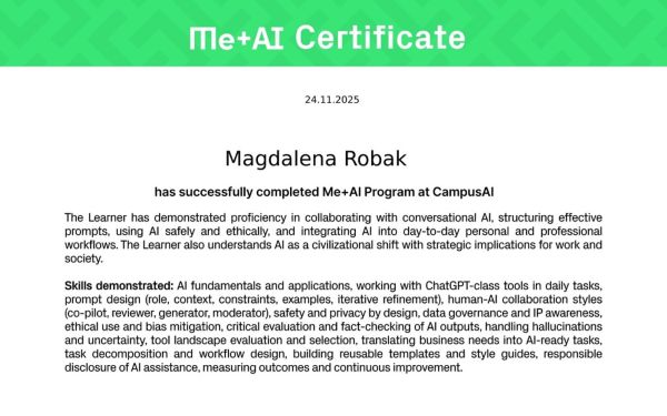 Oficjalny, ponieważ zaliczyłam „bazę” (ME&AI) i teraz mogę szaleć z kolejnymi kursami 🙂