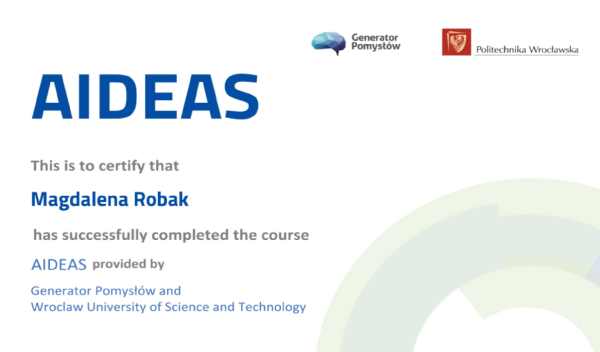 15.12.2023 odebrałam certyfikat zaliczenia kursu „AI (Artificial Intelligence) for Managers” (Elephant AI) 🙂 7 tygodni intensywnego słuchania i myślenia, test (35/35 ;)) + zaliczenie – opracowanie koncepcji rozwiązania wykorzystującego technologie AI do naprawienia konkretnego problemu Klienta-Firmy. Dumna jestem, że wśród 350 projektów mój został wyróżniony jako jeden z najlepszych 🙂